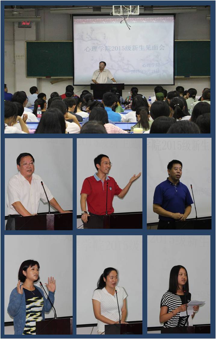 9月18日晚七点,心理学院2015级新生见面会在惟义楼w7102召开。大会由院党委副书记江新喜主持,党委书记池平清,副院长罗照盛、左传明、雷万胜、张璟,各年级辅导员及15级本科生、硕士研究生、博士研究生参加了大会。