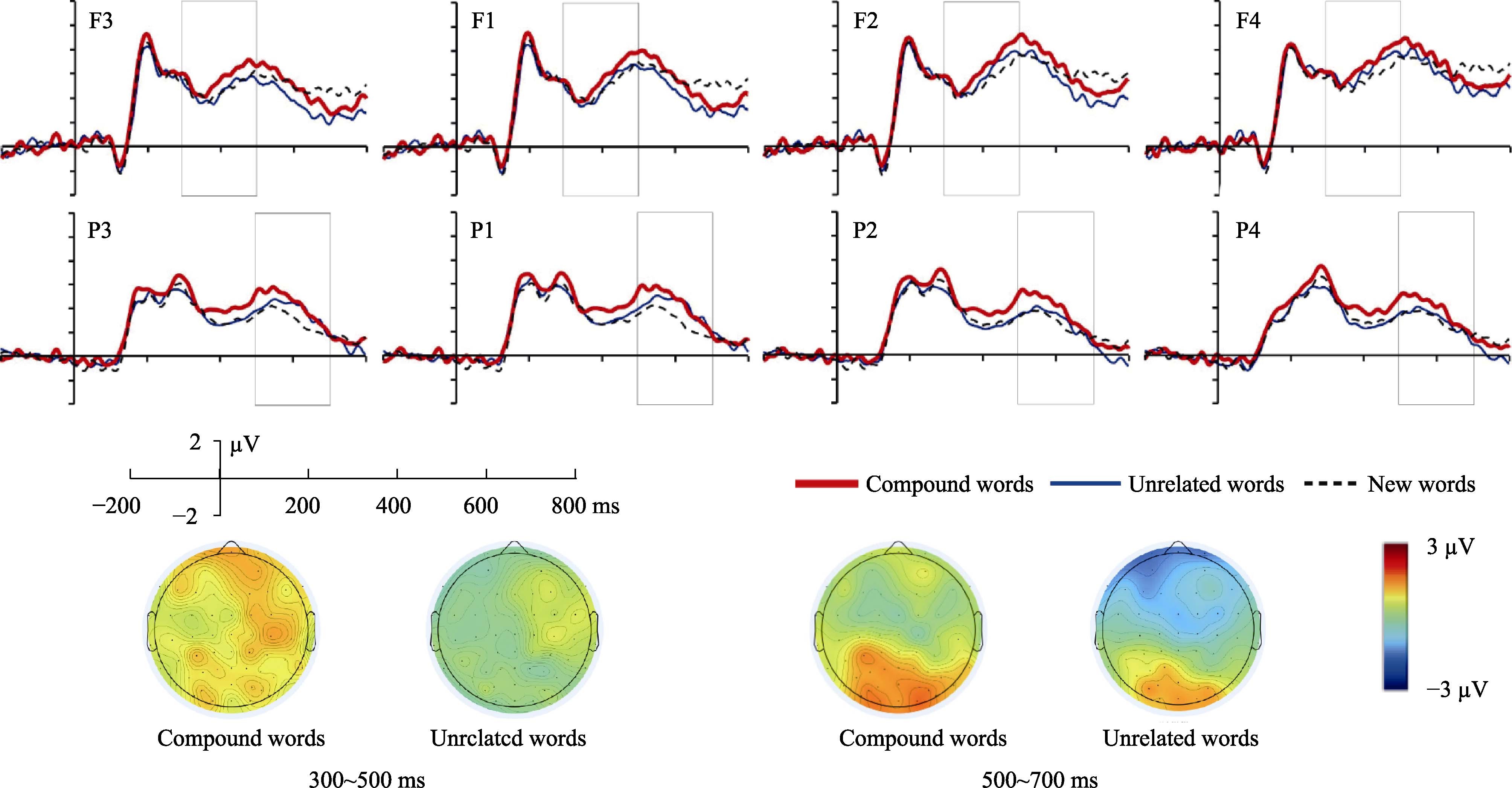 图2老年人在复合词和无关词条件下的额区和顶区新/旧效应及地形图