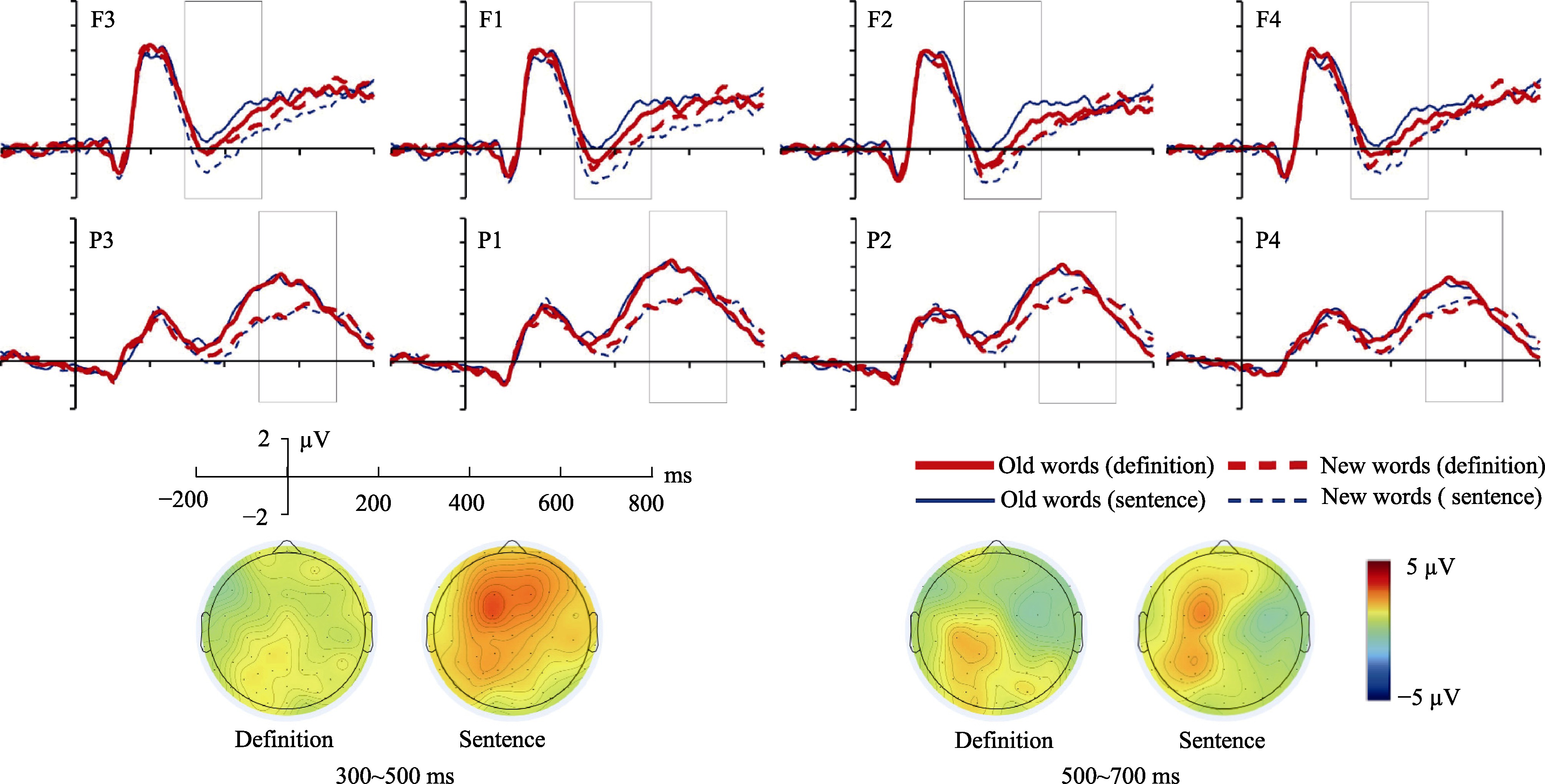 图4老年人在定义和造句条件下的额区和顶区新/旧效应及地形图